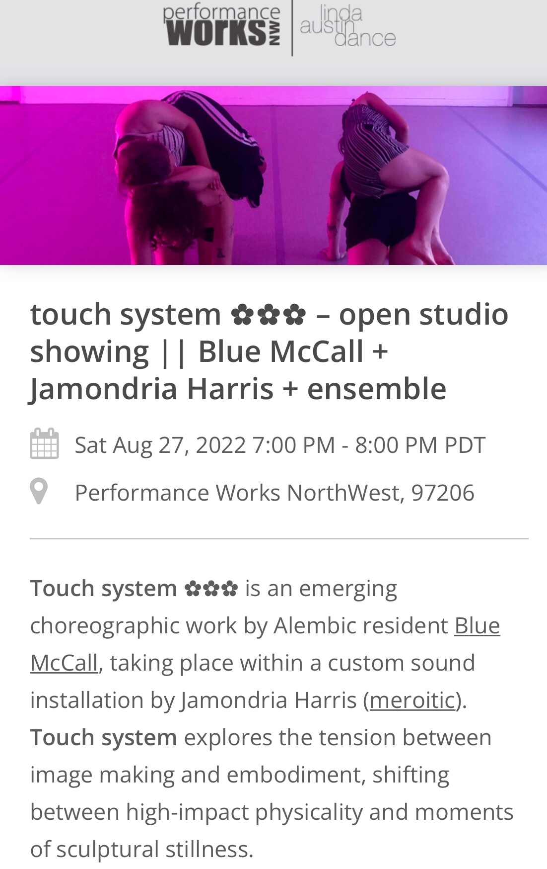 Alembic Artist in Residence at Performance Works NW, Portland, OR. Alongside Adriana Adouma, dee buestos, and Pepper Pepper.