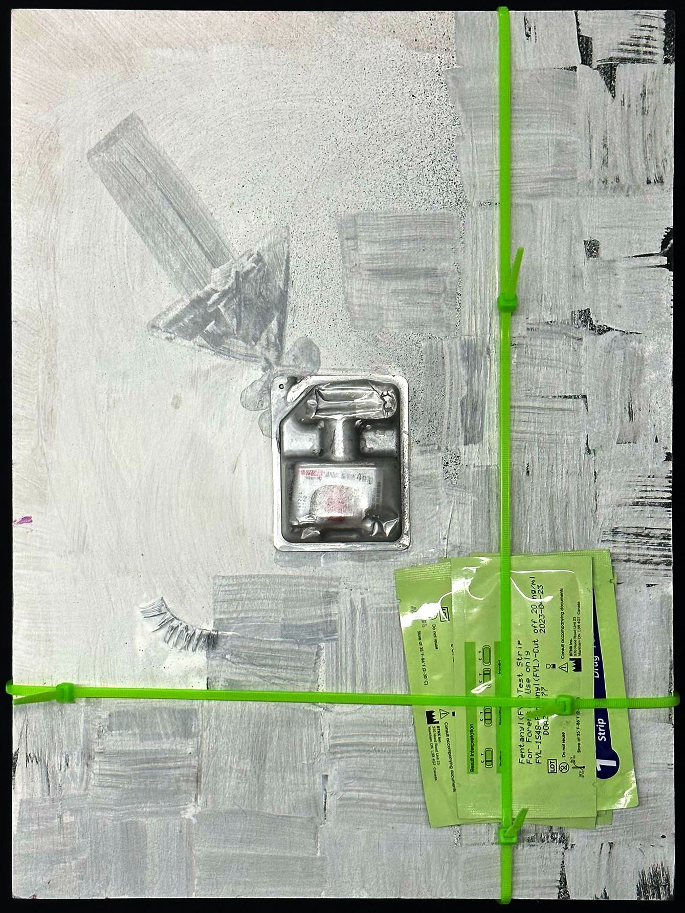 Paint, fentanyl test strips, zip ties, eyelash, and new Narcan canister on wood panel